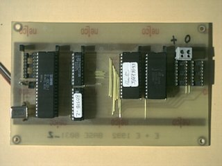 Une première carte processeur avec : - 8031 (ou dérivé à 40 broches), - 8 à 32 ko d'EPROM + 8 à 32 ko de RAM, - Sorties vers afficheur LCD, extension,... Très pratique pour la mise au point du soft car (selon la configuration de la GAL) la mémoire programme (program memory) est identique à la mémoire de données externe (external data memory). Un programme chargé dans la mémoire de données externe (avec l'assembleur de la page outils electronique par exemple) peut donc être exécuté (et debuggué) comme un programme standard. Sera a terme replacée par une carte avec le nouveau standard de connecteur. |