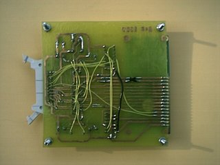 Les fils jaunes et noirs évitent d'avoir à réaliser une carte double face. Sur certains afficheurs, il faut croiser les lignes d'alimentation du retro eclairage (en haut à droite de la photo). Vous trouverez ici la liste des liaisons à faire. |