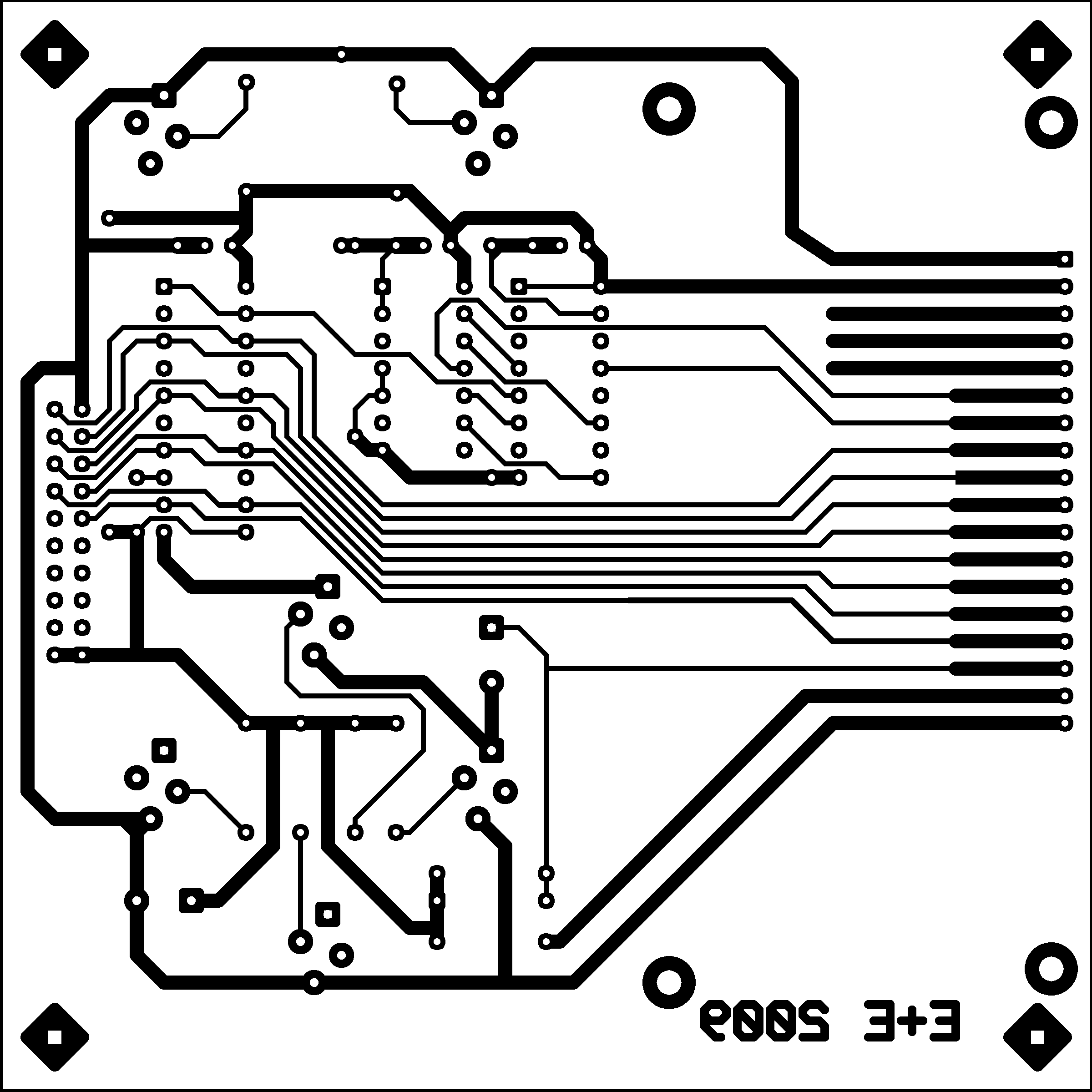 Cliquer sur l'image pour faire apparaitre le typon en pleine résolution (74 ko). La platine fait 4 x 4 pouces (102 x 102 mm) et la résolution du fichier est de 600 dpi. |