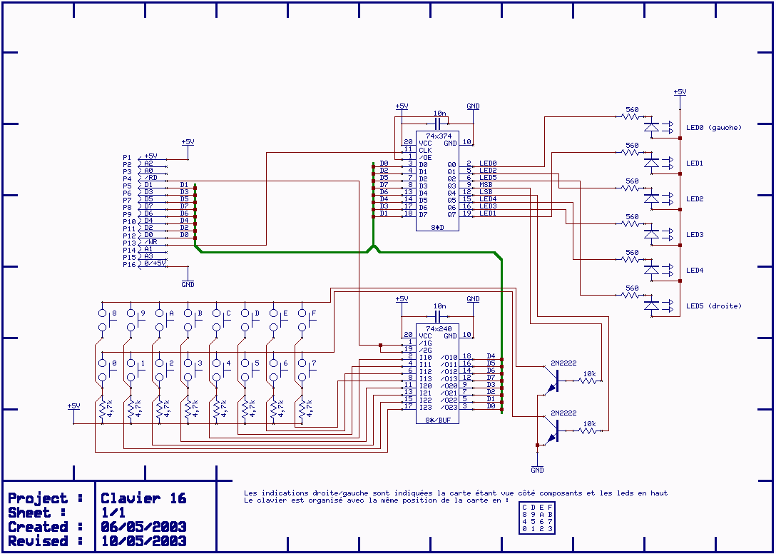 Une carte clavier/leds avec : - 16 touches,: - 6 leds.: (A utiliser avec la bibliothèque libcla1.zip): Cette carte est à mon ancien standard d'interconnexion et peut être directement reliée à la carte 8031 "base 1" via des connecteur DIL 16 fils. Pour une nouvelle application je recommande d'utiliser le nouveau standard. |