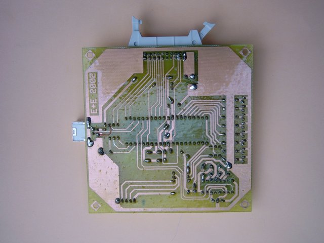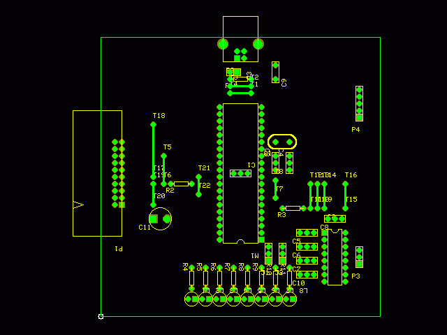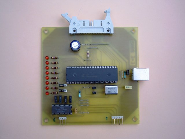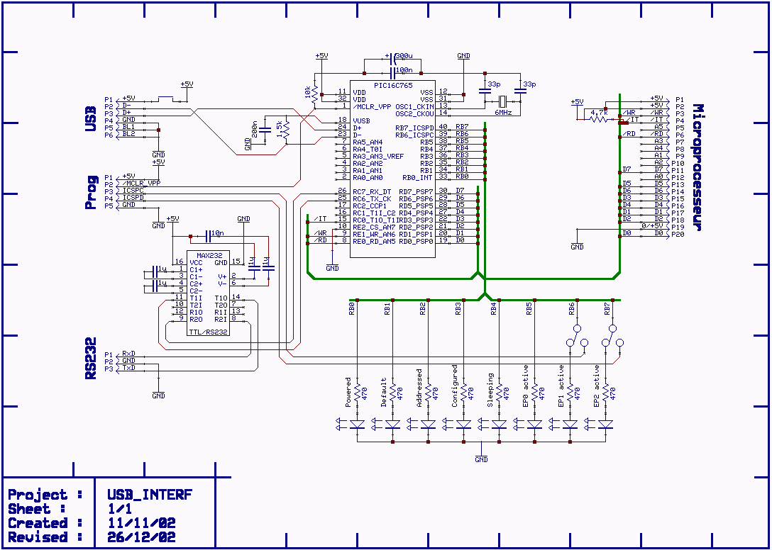 Une carte interface USB utilisant un PIC16C765, utilisable : - En interface USB d'un montage plus complexe (le PIC16C765 est alors en esclave du système), - En carte autonome (conversion USB->RS232 ou tests par exemple), - En support de programmation. Pour faciliter les tests, 8 leds sont connectées au bus B du PIC16C765 (voir SHOW_ENUM_STATUS de usb_ch9.asm fourni par Microship). |