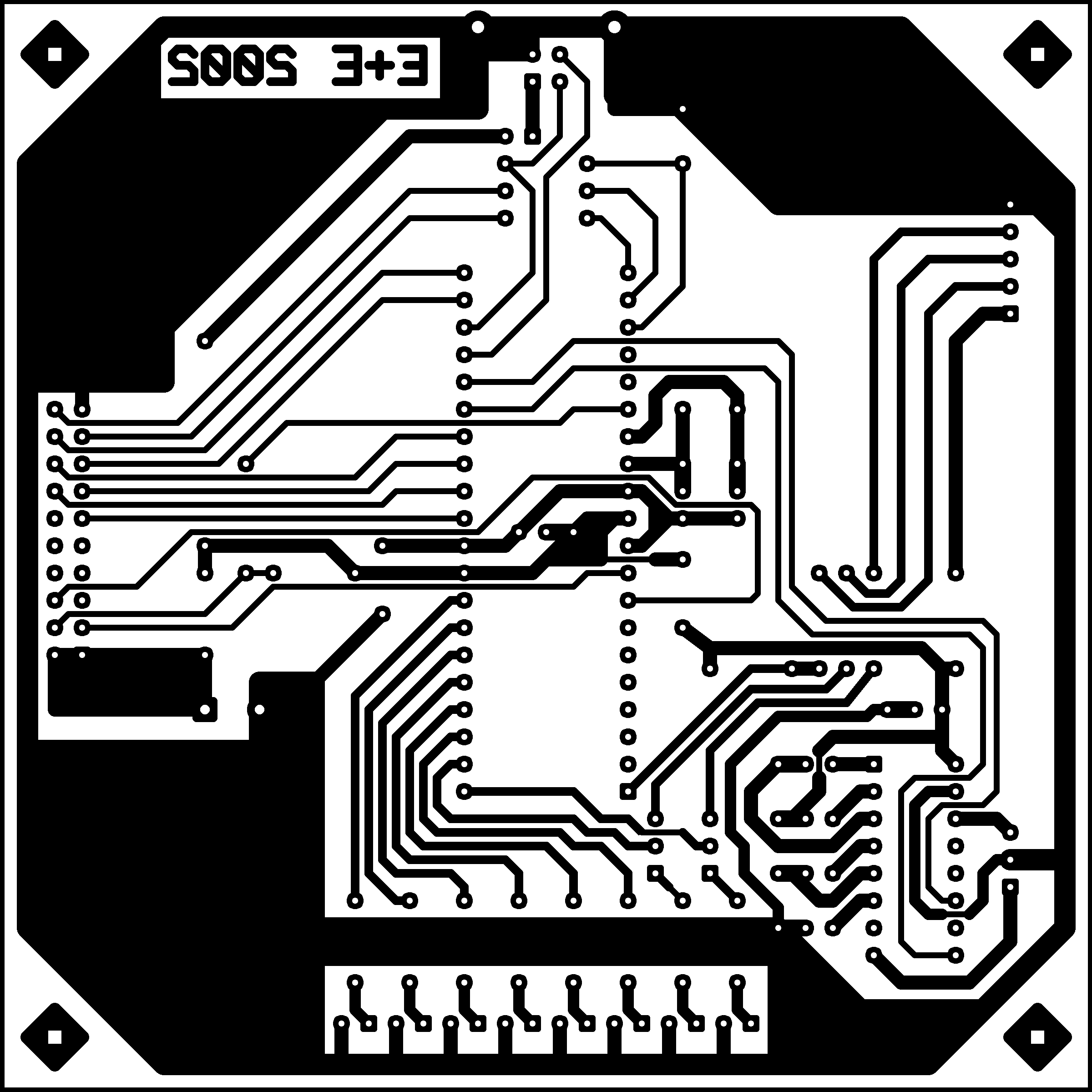 Cliquer sur l'image pour faire apparaitre le typon en pleine résolution (99 ko) ou ici pour le télécharger. La platine fait 4 x 4 pouces (102 x 102 mm) et la résolution du fichier est de 600 dpi. |