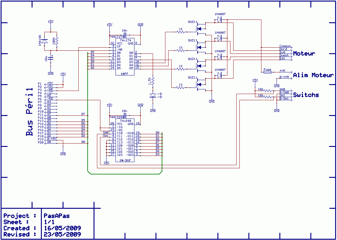 Le courant est limité par les transistors de sortie (BUZ11) et les diodes de roue libre (1N4007). Un fusible protège la partie de puissance. On peut connecter deux contacts de fin de course. |
