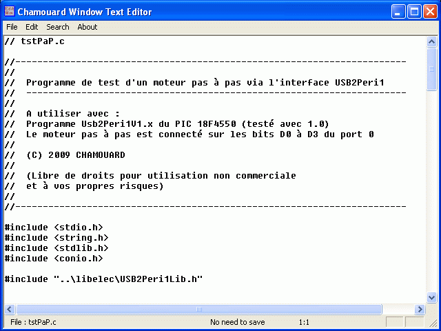 Tout est contrôlé à travers l'interface Péri1. Vous trouverz ici (22 ko) un programme de test en VC6.0 utilisant l'interface USB->Peri1 avec les modes à "pas complet", "couple maximal" et "demi pas". |