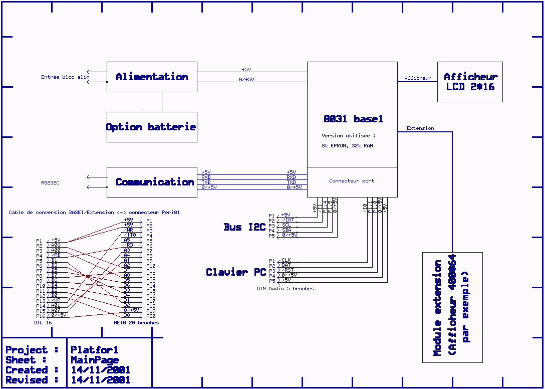Le synoptique global de la plateforme. Le cable proposé permet l'interconnection donc le test des cartes avec le nouveau format de connecteur ("Peri01") (hors IT). Voir la page aquarium pour la connection directe d'un afficheur. |