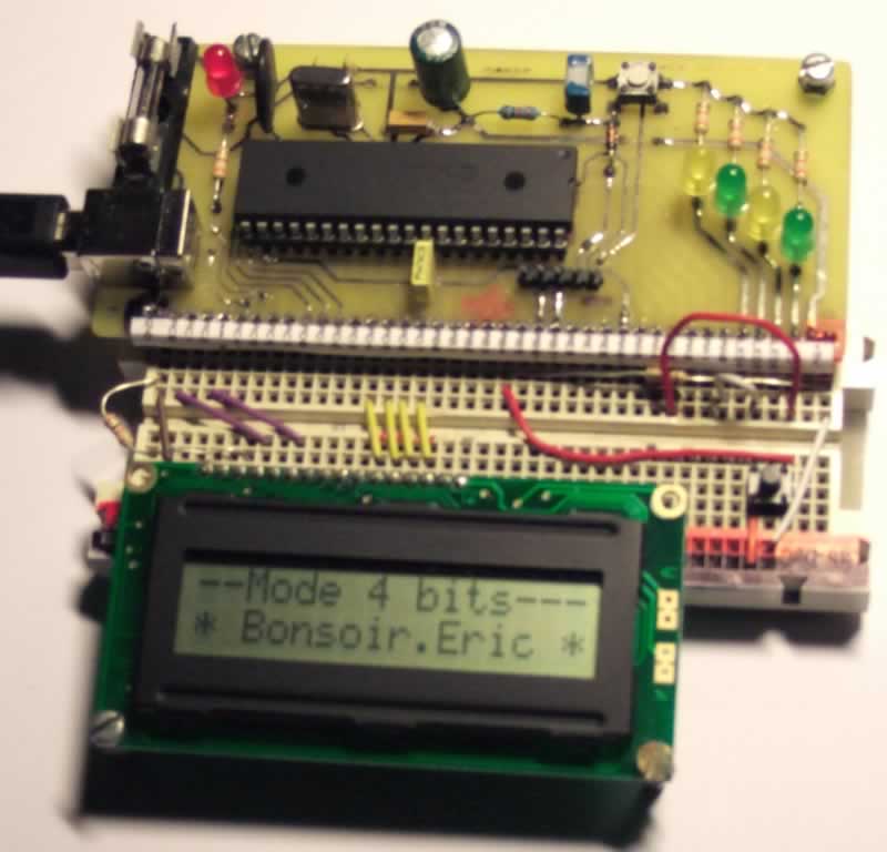 Test de l'interface PIC 18F4550 avec un module LCD en mode 4 bits. Actuellement, pour la programmation avec bootloader, je mets sur ma carte Lab-dec, un bouton-poussoir et une résistance connectés à RB4. |