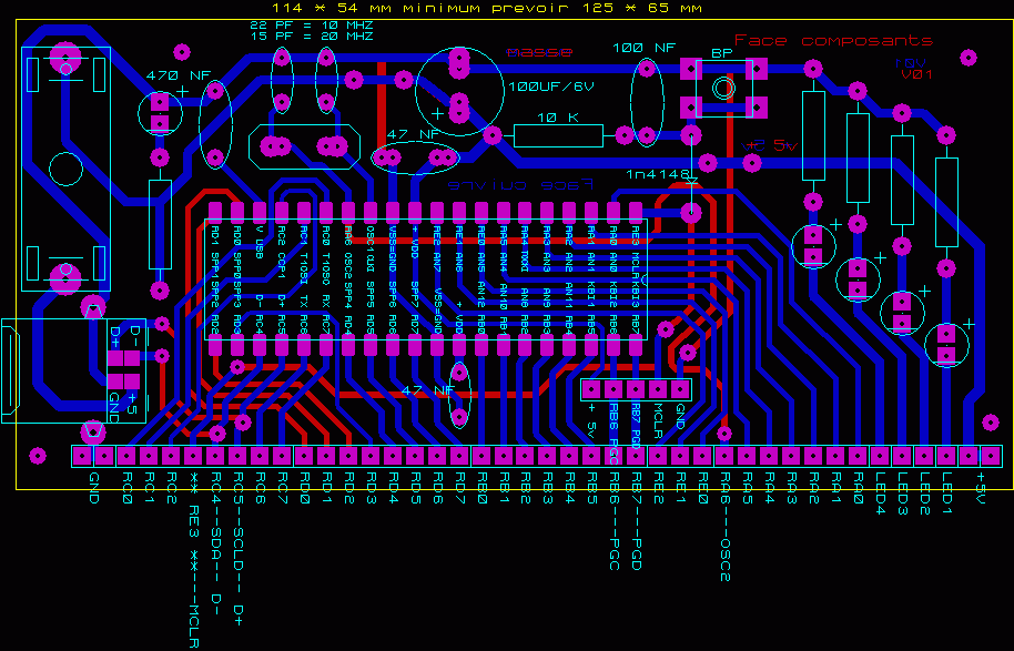 Cette carte, est le version V01 de ma carte pour développement à partir du port icsp et/ou du bus USB (type bootloader). |