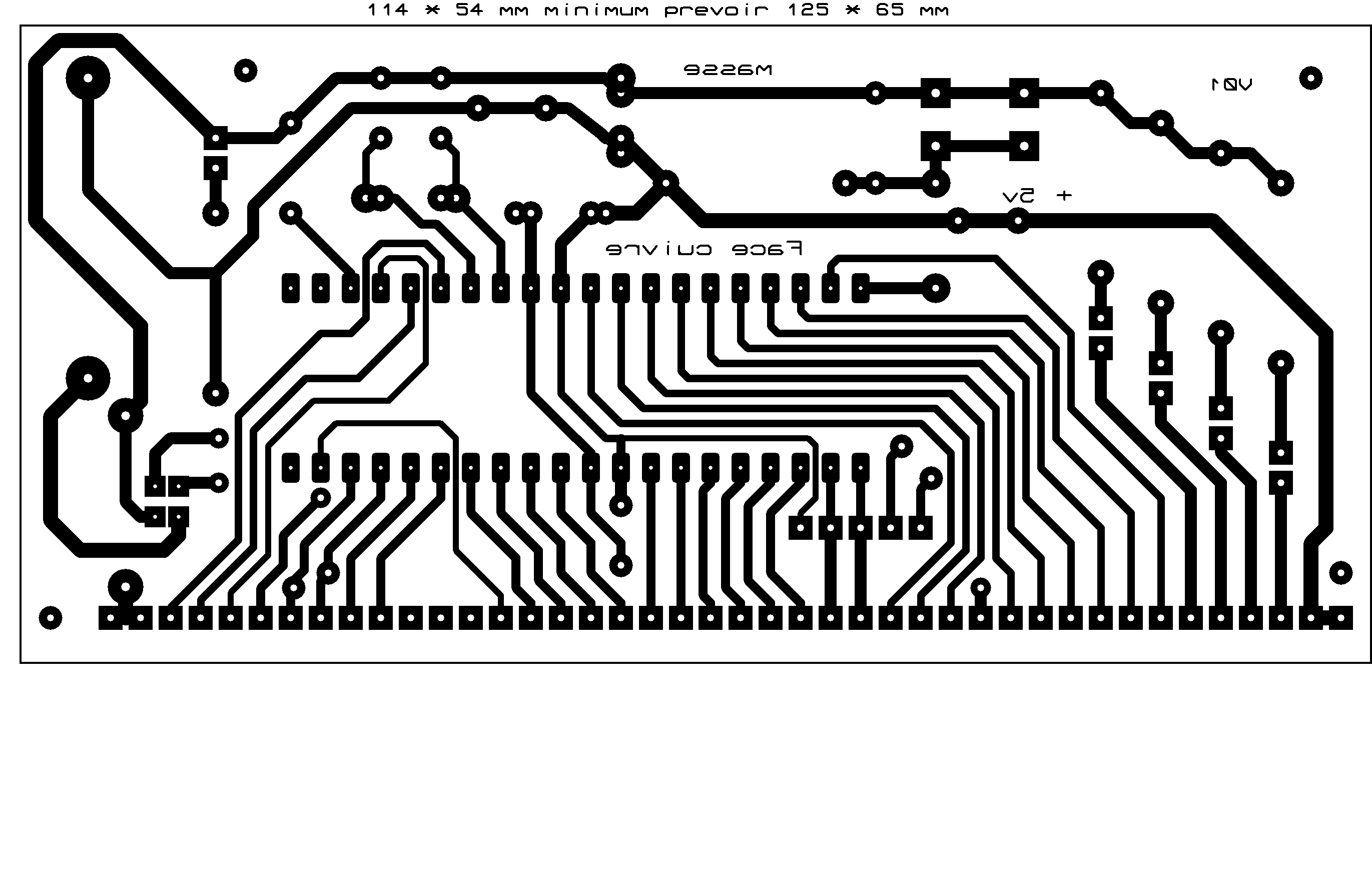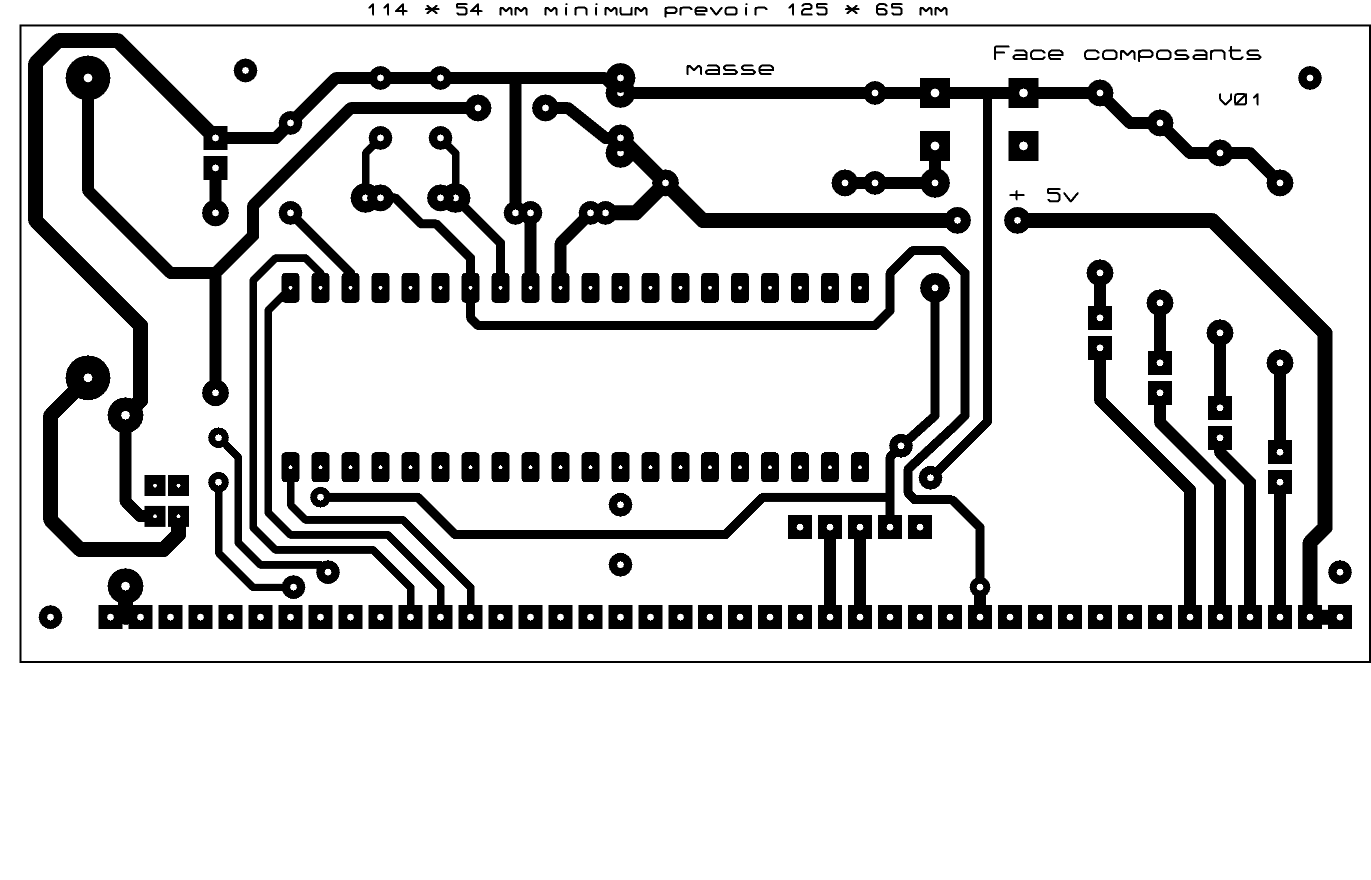 Côté composants. Le fichier Carte PIC 18F4550 V01.LYT (60 ko) a été développé avec ARES de chez PROTEUS version 5.2. Ceux disposants de ce logiciel, pourront si ils le souhaitent modifier l'implantation. Pour les autres, le circuit étant en double face, je vous ai mis les implantations coté composants et coté cuivre en fichier GIF, avec la plus haute résolution possible. |
