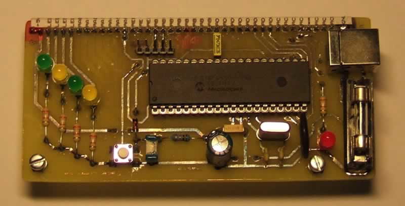 Le schéma est une application directe des data sheets de Microchip. Dans le cas du bootloader, il faut impérativement utiliser un quartz de 20 MHz trés exactement (n'est-ce pas ? Le long connecteur au bas de la carte, permet un montage sur une carte de développement type Labdec. |
