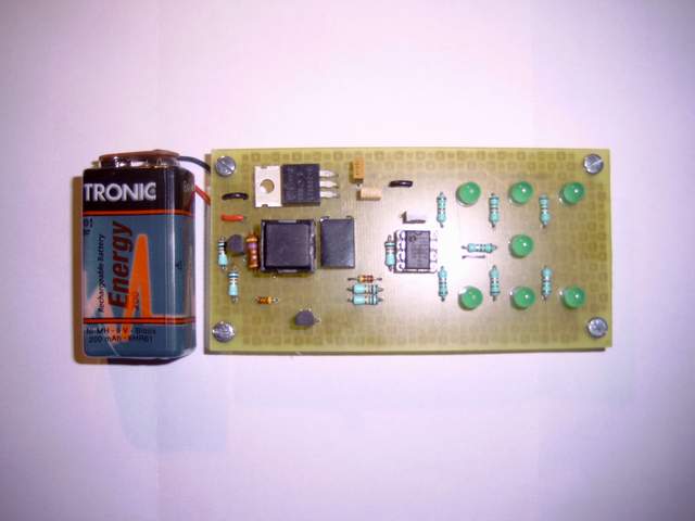 Le prototype réalisé sur une carte d'expérimentation avec exactement le même cablage que le typon ci-dessus. Le tout se place (tout juste) dans un coffret Heiland HE222. |