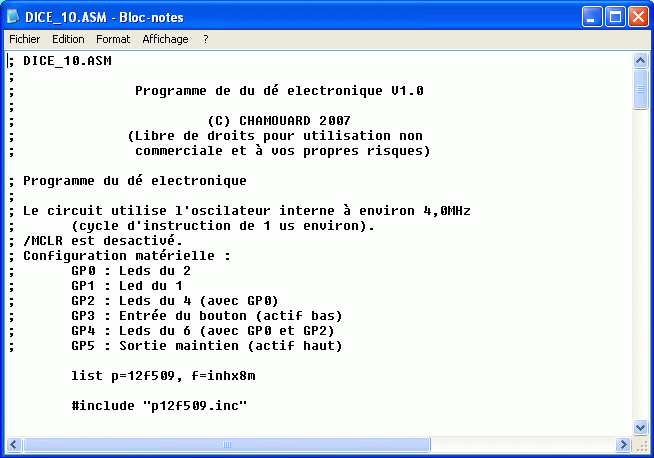 Le logiciel du 12F509 (source et exécutable) : DICE_11.zip (2 ko) (l'executable en format intel-32). |