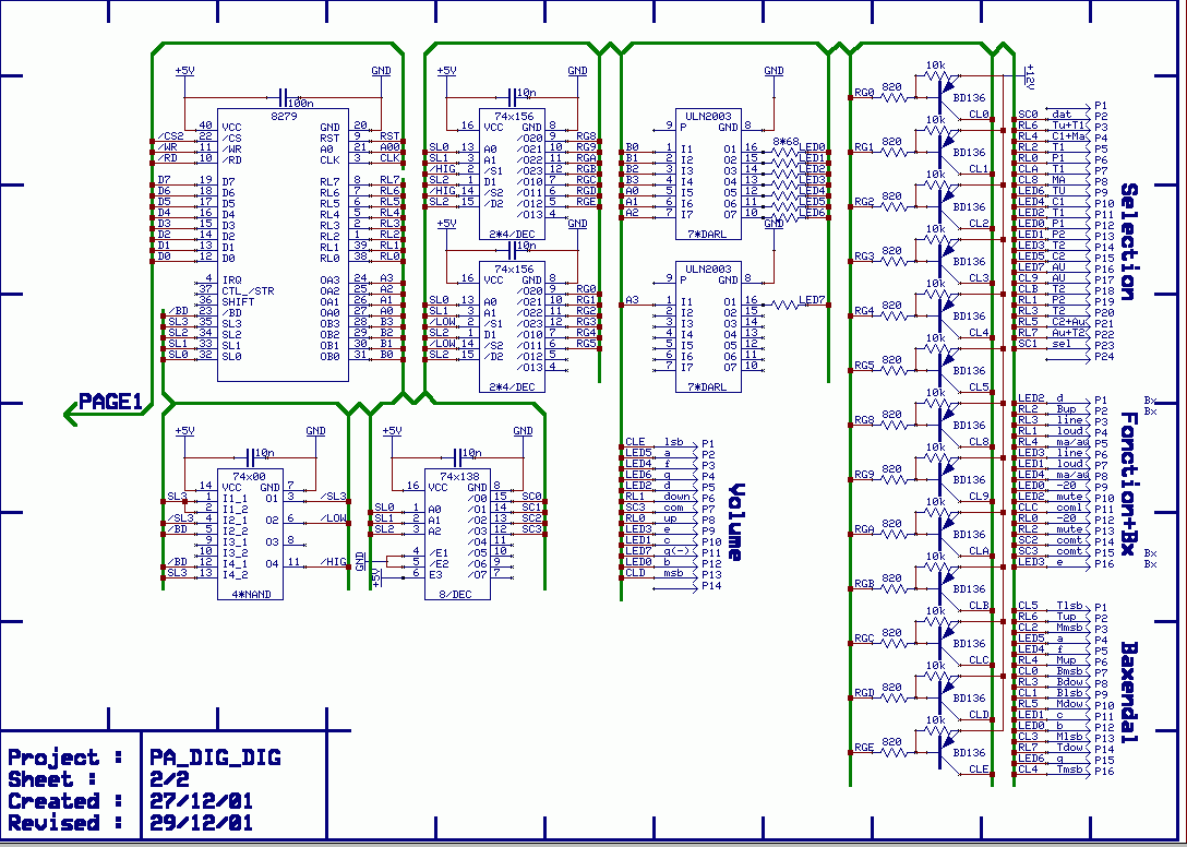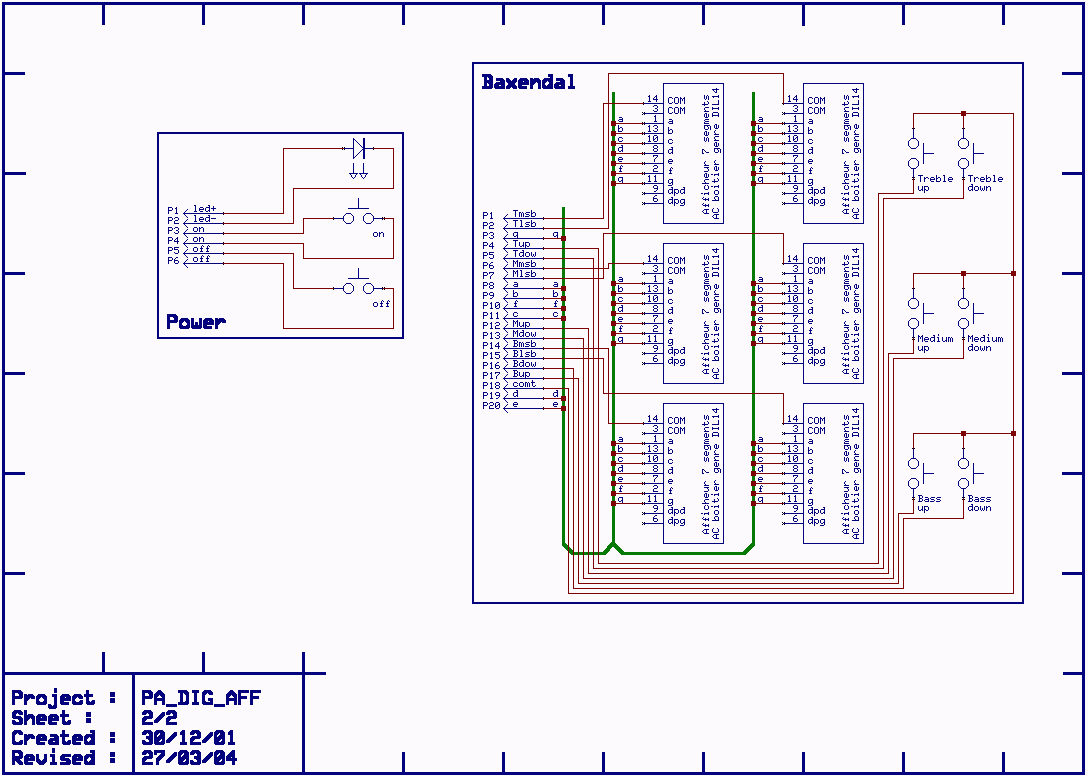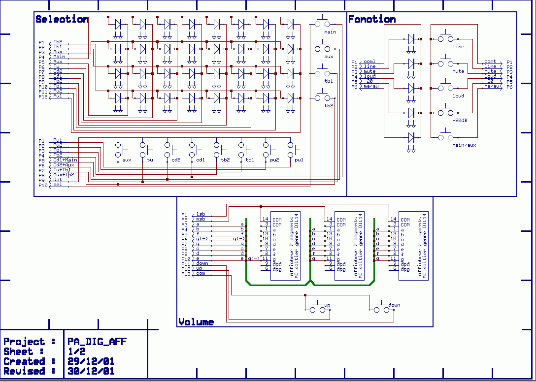 Une réalisation commencée il y a un certain temps (1988). Cette description est à jour de la réalisation, c'est à dire que les parties baxendal (réglages graves/aigus et volume fin) ne sont pas encore opérationnelles. En fait j'utilise la sortie de ce préampli vers un ampli du commerce et n'ai pas besoin dans l'immédiat de ces fonctionnalités. En plus de ces points à compléter, je referai surement un jour la partie numérique pour utiliser un PIC ou un 8031. Le zip qui contient le logiciel donne la philosophie de réalisation. |