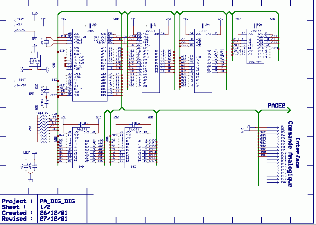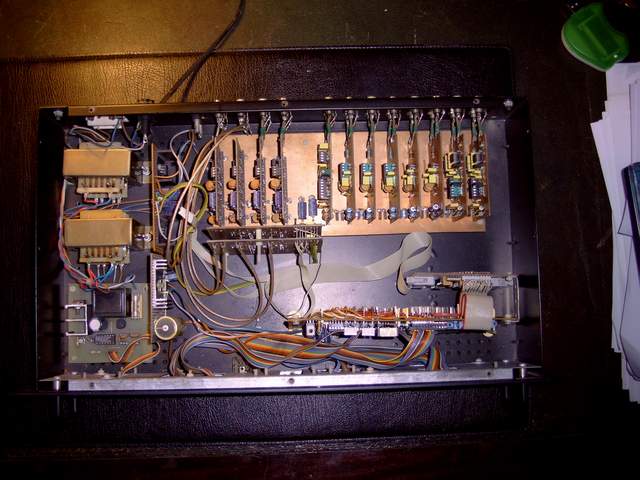 La partie commandes : - Le coeur est un 8085 avec EPROM et RAM, - Le coeur de la partie clavier et afficheurs est bâti autour d'un 8279, - Une (et unique) interface pour transmettre les commandes à la partie analogique. J'ai réalisé cette partie en wrapping. Je peux fournir l'implantation des composants si quelqu'un la souhaite. |