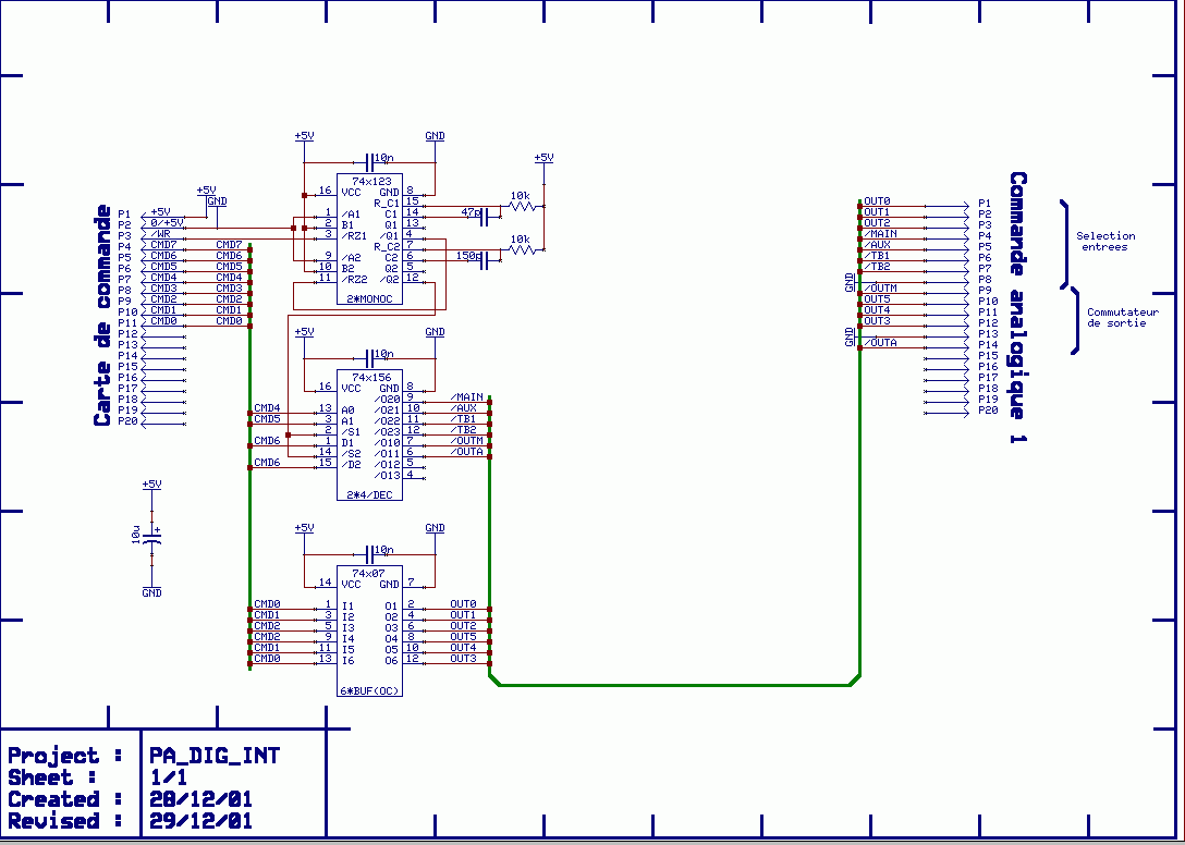 L'unique liaison entre la partie numérique et la partie analogique. Toutes les commandes sont en collecteur ouvert pour ne pas parasiter l'analogique avec l'alimentation du numérique. Je l'ai réalisé sur un petit CI d'essai. |