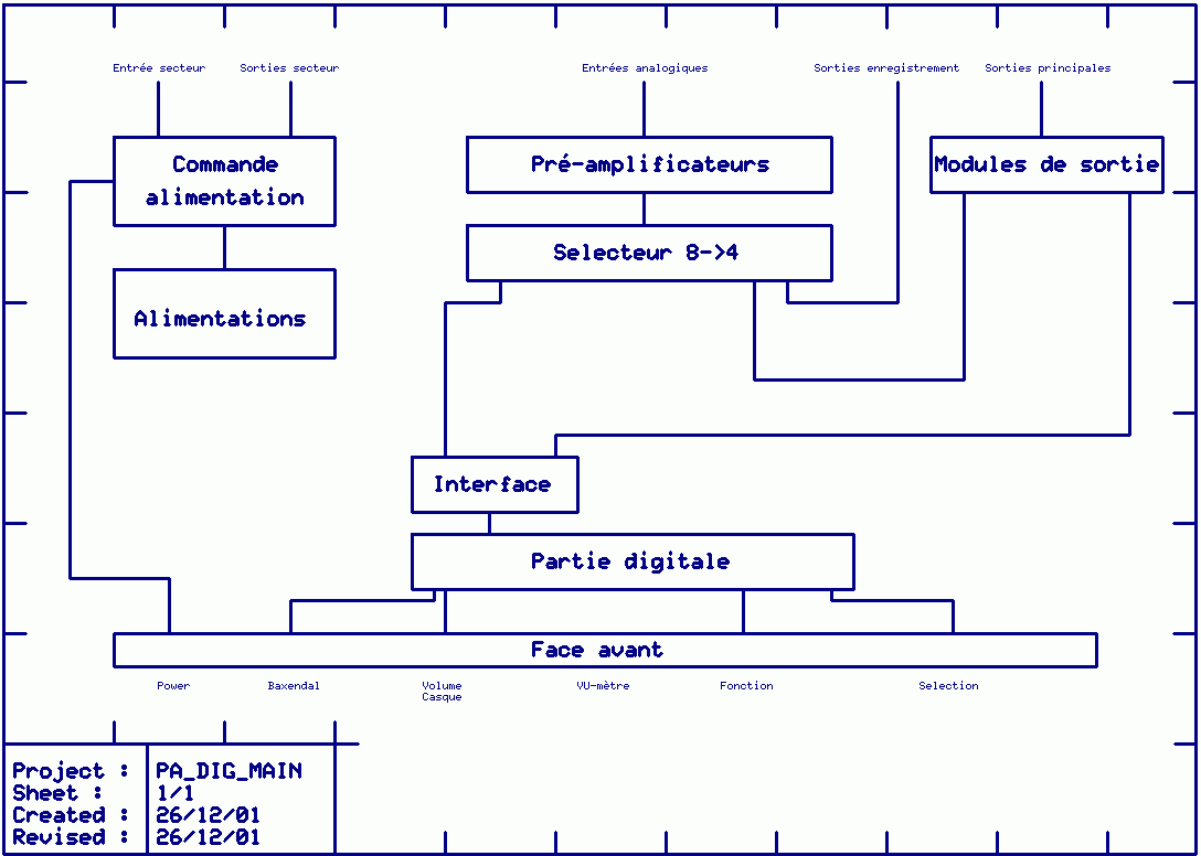 Le synoptique général de la version actuelle. Il manque encore le baxendal, le VU-mètre, la volume et la sortie casque. |