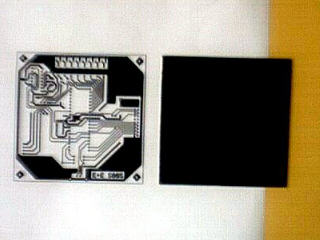 Il faut ensuite avoir une impression du typon. J'utilise une imprimante laser en 600 dpi. L'impression doit être faite "à l'envers" car la face imprimée doit être placée contre le circuit à graver (par contre du noir sur le typon est bien une piste sur le circuit avec cette gravure dite "positive"). Il est aussi possible d'utiliser une photocopie (jouer avec le zoom si la photocopie n'est pas tout à fait à l'échelle). |