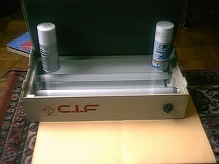 Il faut ensuite rendre l'impression du typon tranparente aux rayons utilisés par l'insoleuse. J'utilise du "Diaphane" de KF ou un équivalent. Bien imprégner la page et laisser sécher. J'insole ensuite environ 4 minutes avec mon insoleuse à deux tubes (ne pas oublier de retirer le plastique noir de protection de la résine photosensible !). |