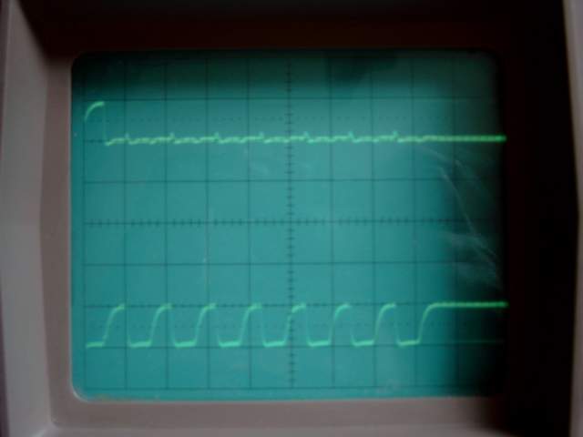 Le programme de test (source en VC et exécutable téléchargeables ici (20ko)) qui se déroule en trois phases : - Test de clignotement lent des leds (visible à l'oeil nu), - Test de clignotement rapide des leds qui nécessite un oscilloscope (voir ci-dessous), - Test en entrée du module où il suffit de mettre à la masse un bits du RAVAR (D2 à D7) pour voir si l'état lu par le PC change. |