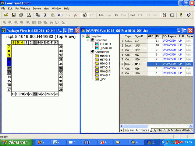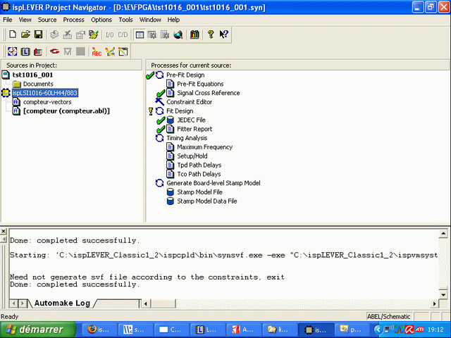 J'ai uilisé l'outil ispLEVER fourni par Lattice. Après le choix du composant, on inclut le programme source ici un fichier Abel. Vous trouverez ici (11 ko) tous les fichiers de ce projet. |