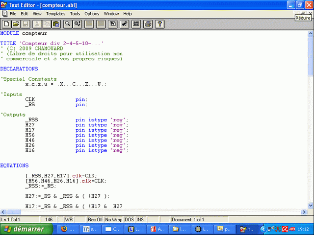 La fenêtre d'édition du fichier Abel avec le programme de test utilisé ici, un diviseur numérique par 2, 4, 8, 10, 20 et 40.Cela permet de générer du 20MHz, 10 MHz, 5 MHz, 4 MHz, 2 MHz et 1 MHz à partir d'une horloge à 40 MHz. |