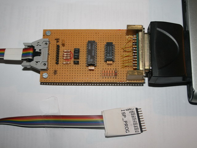 Vous trouverez facilement sur le site de Lattice le schéma du programmateur connectable à une interface PC parallèle. Ici racordé à une petite interface pour une plaque de prototypage Labdec. |
