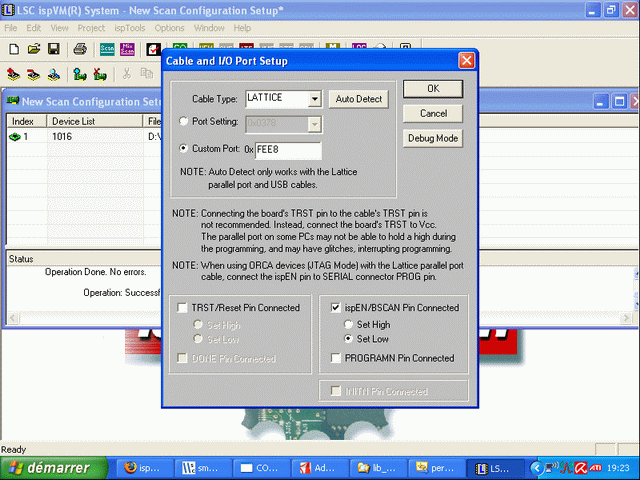 Fenêtre de paramétrage de l'outil de programmation ispVM de Lattice. L'adresse bizarre vient de l'utilisation d'une carte PCMCIA sur mon portable. |