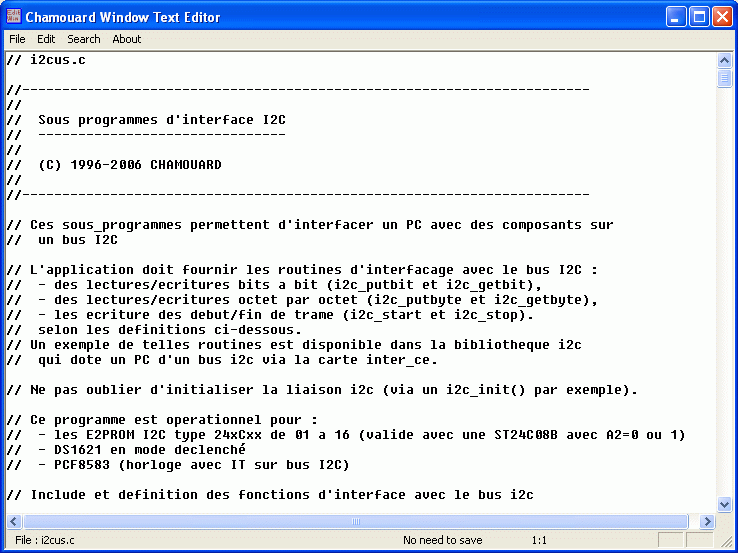 Une bibliothèque d'interface (téléchargeable ici (4ko)) avec quelques composants I2C et utilisable avec l'interface I2C sur port parallèle, bus USB,... ou votre propre interface. Composants supportés : - E2PROM I2C (testé sur 24C08B, PCF8582 et 24LC64), - Capteur de température : DS1621, - Interface 8 bits : PCF8574 ou PCF8574A, - Horloge / mémoire : PCF8583. |