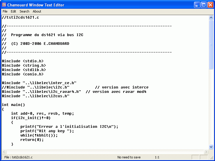 Les programmes de test (source en C et executable pour l'interface USB à I2C avec le module RAVAR MOD4) : - Test des E2PROM I2C : ici (33 ko), - Test d'un DS1621 : ici (33 ko), - Test d'un PCF8574 : ici (29 ko), - Test d'un PCF8583 : ici (31 ko). |