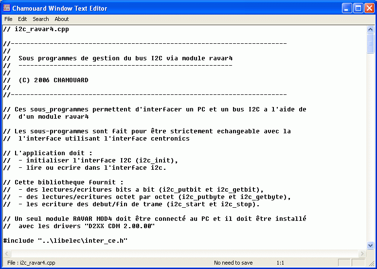 Le source d'interface logicielle téléchargeable ici (8ko). L'interface est 100 % identique à l'interface utilisant le port parallèle du PC et ne nécessite aucune modification du source du programme utilisateur : modifier l'include et l'édition de lien, c'est tout. Des programmes exemples sont fournis (source et excécutable) dans la page librairie I2C. |