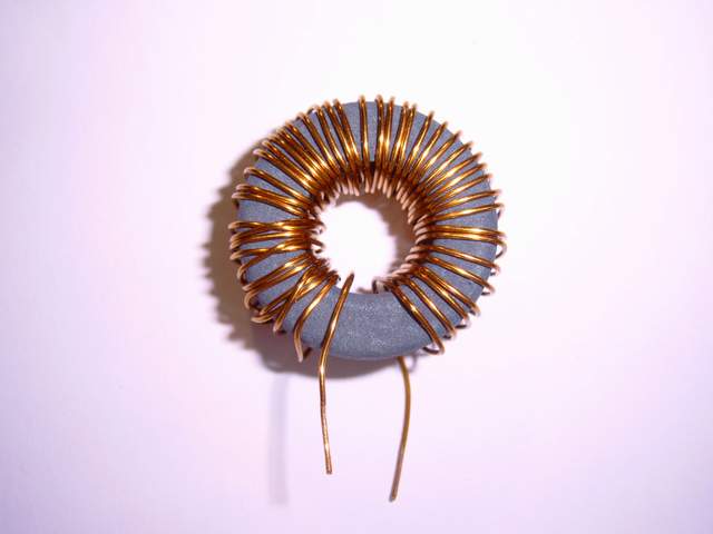 Une self typique pour alimentation à découpage : - Fil de cuivre émaillé autour d'un tore. Deux paramètres fondamentaux : - La valeur de la self (comptée en Henry), - Le courant de saturation (en Ampère). |