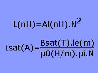 Exemple (la self de la photo ci-dessus) : Données fabricant (matériau 2P80 poudre de fer en taille 26,5x14,9x10,7 avec 46 spires) : Al=94 nH, Bsat=1,4 T, le=0,062 m, µ0=1,257 10-6 H/m, µi=90 L=94*46*46=199 µH Isat=(1,4*0,062)/(1,257 10-6*90*46)=17 A |