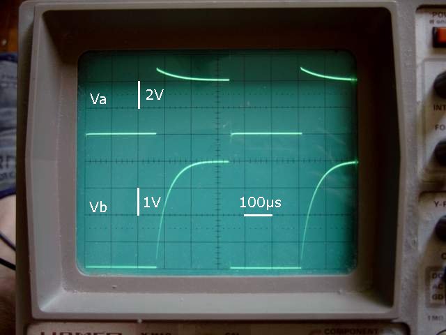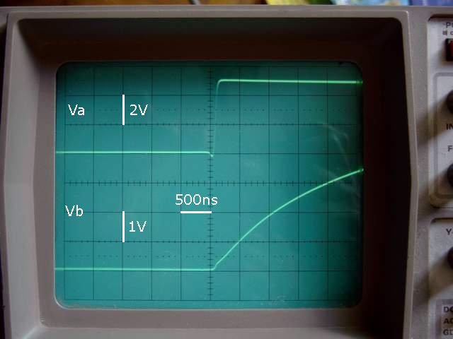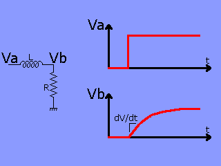 On applique un échelon de tension à un réseau L/R. La tension Vb est de la forme : Vb(t)=Va.(1-exp(-R.t/L)) Soit : dV/dt=Va.R/L.exp(-R.t/L) Si on mesure la pente à l'origine à l'osciloscope (dV/dt)(0) on peut en déduire la valeur de la self : L=(Va.R)/(dV/dt)(0) |