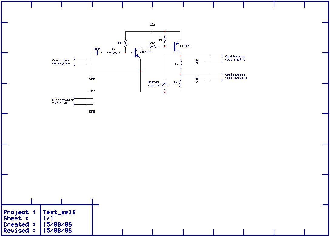 Un simple commutateur de puissance commandé par un générateur de signaux. Pour une mesure plus précise, le TIP42C peut être remplacé par un MOSFET de puissance (plus faible resistance à l'état passant). La diode n'est pas nécessaire si le transistor de puissance supporte le pic de tension négative. |