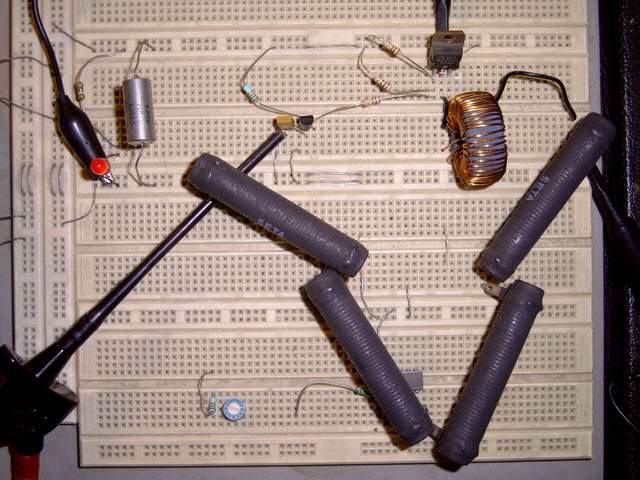 Montage assez simple pour une plaque d'expérimentation. La résistance est formée par les 4 résistances de puissance noires montées en série. |
