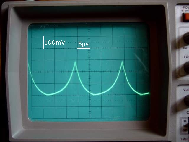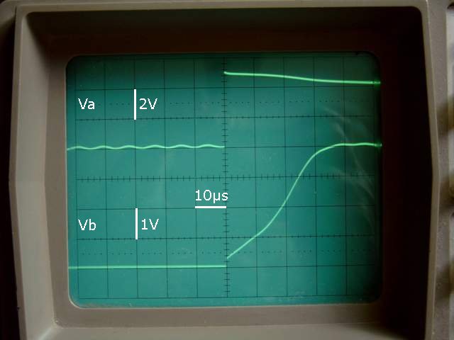 Test de la self ci-dessus avec une résistance de 6 Ohm. La chute de tension de Va est due à la résistance du TIP42C. Le petit saut à l'origine est dû à la self des résistances de puissance (à éviter). On mesure une pente de : 120000 V/s (0,6 V en 5 µs) L'inductance de la self est donc de : L=(4,6 V*6 Ohm)/(120000 V/s)=230 µH pour une valeur théorique de 200 µH |