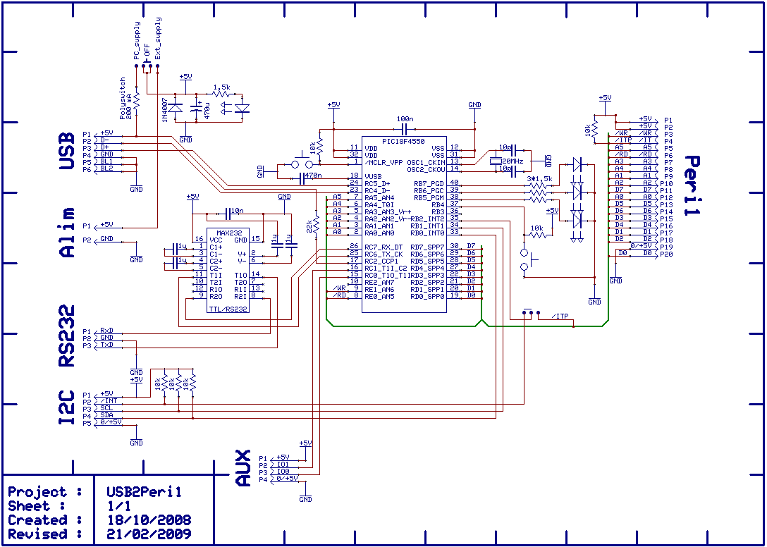 Le schéma est basé sur un PIC18F4550. Pour cette application, toutes les parties I2C, RS232 et AUX peuvent être omises. L'alimentation peut provenir : - Du PC avec une protection à 200 mA, soit environ 150 mA pour les applications, - D'une source externe pour les applications nécessitant plus que 150 mA. |