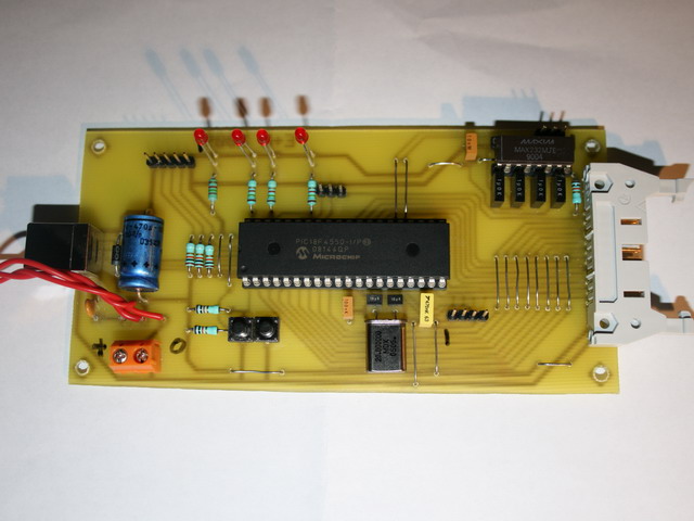 Ce circuit comporte 20 straps pour éviter d'avoir à réaliser une carte double face. 2 strap sont en dessous du PIC 18F4550 et un sous le MAX232. La résistance de 22 k est montée côté soudures, elle aussi sous le PIC. |