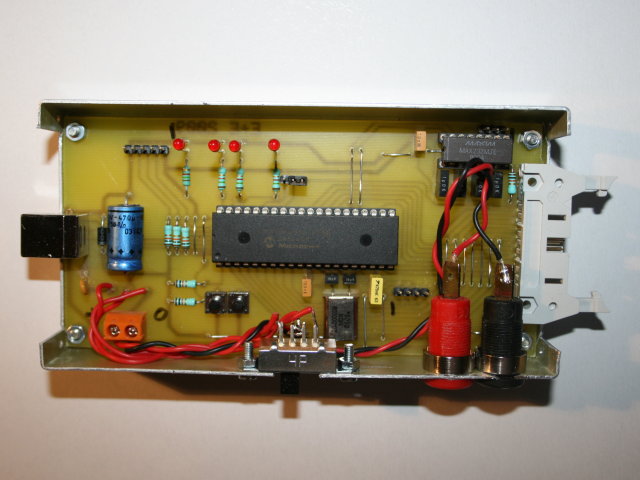 La carte se monte dans un coffret TEKO 4/A.1 (140 x 72 x 28 mm). Sur la photo on voit l'interrupteur à 3 positions et les deux douilles IEC 61010 pour l'alimentation externe. |