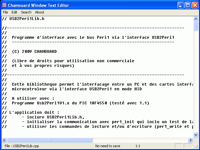 Vous trouverez ici (4 ko) une librairie permettant d'accéder aux service de l'interface avec tout programme écrit en C et qui est compilable avec Visual C++ 6.0. Ici (25 ko) un programme de test de cette librairie utilisant un clavier afficheur 6 touches standard. |