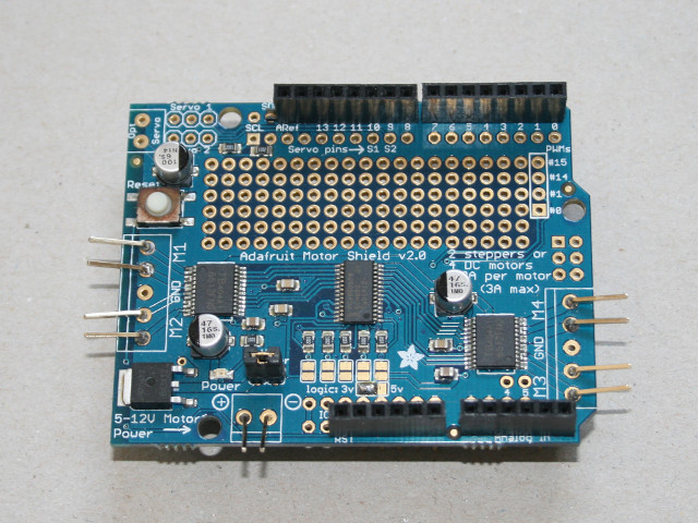 Une carte Adafruit (Adafruit Motor Shield V2.0) pouvant commander 4 moteurs continus (ou 2 moteurs pas à pas) et deux servo-moteurs. Seul le niveau des entrées sorties est à configurer (d'ou la petite boule de soudure visible sur la photo au mileur et en bas de la carte). Utilisée dans "Robot 2". |