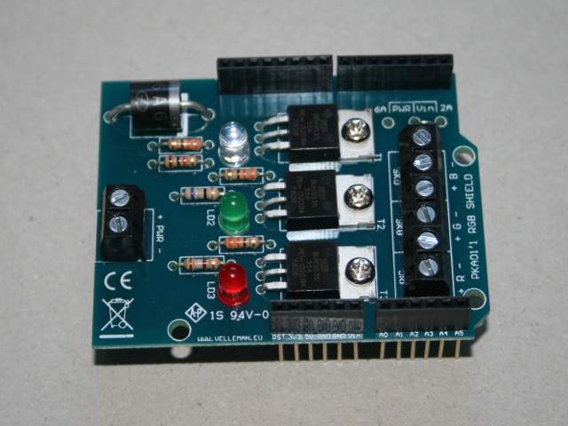 Un shield RGB en kit (existe aussi monté) de chez Velleman pour commander une LED RGB. Pour l'instant juste testée, mais doit finir dans un (mini) projecteur DMX. |