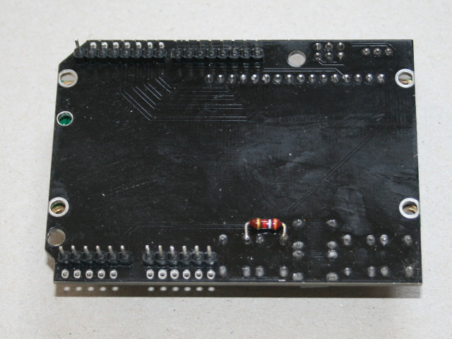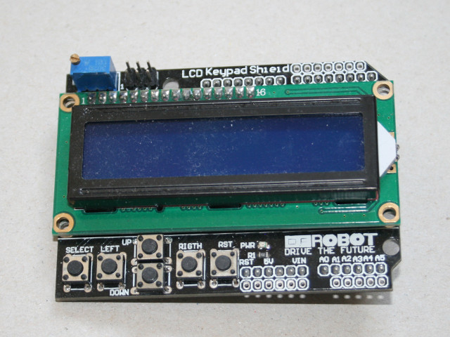 Une carte DFRobot avec un afficheur 2 lignes de 16 caractères avec des boutons (5 et un pour le reset). Utilisée dans "Robot 2". Je l'ai modifiée pour la rendre compatible d'une carte chipKIT UNO32 car la lecture des boutons s'effectue via une entrée analogique avec un réseau de résistance calculé pour une carte Arduino alimentée sous 5V. La carte UNO32 fonctionnant avec un convertisseur 3,3 V, on doit modifier ce réseau de résistance en ajoutant une resistance de 3,9 kOhm comme sur la seconde photo et modifier les seuils de détection des boutons dans le logiciel. |