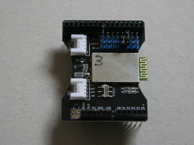 Un shield Bluetooth Seeedstudio avec 2 interfaces Grove. Utilise un module CSR qu'en fait on peut interfacer directement avec la carte Arduino (moins cher). Utilisée dans "Robot 2" avec une carte chipKIT UNO32 et la liaison série matérielle (n'ayant pas trouvé de bibliothèque de liaison série logicielle pour la carte chipKIT). Du coup, il faut débrancher le module bluetooth à chaque téléchargement de programme dans la carte Arduino... Ou utiliser une carte MEGA ou MAX32 qui a plusieurs liaisons série matérielles. |