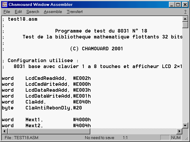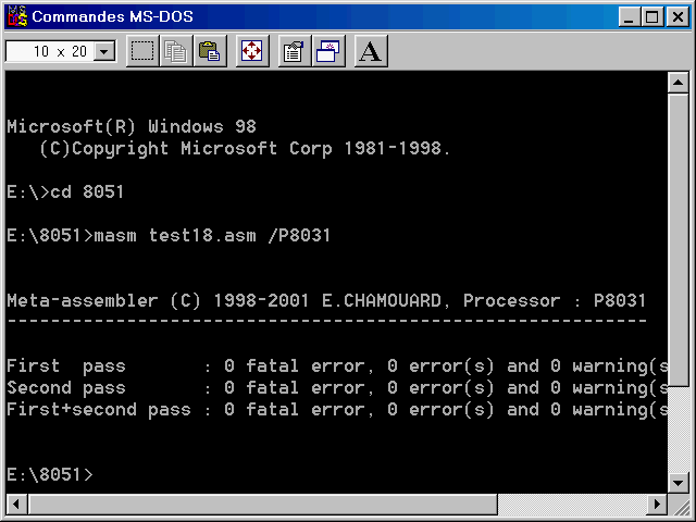 Un assembleur "maison" pour processeur de la famille MCS51 (8031, 8032, 8051,...) ou MCS85 (8085). Ici la nouvelle version DOS (sous WIN32) de l'IDE/assembleur ci-dessus et sa documentation (version 2.1_0) (40 ko). |