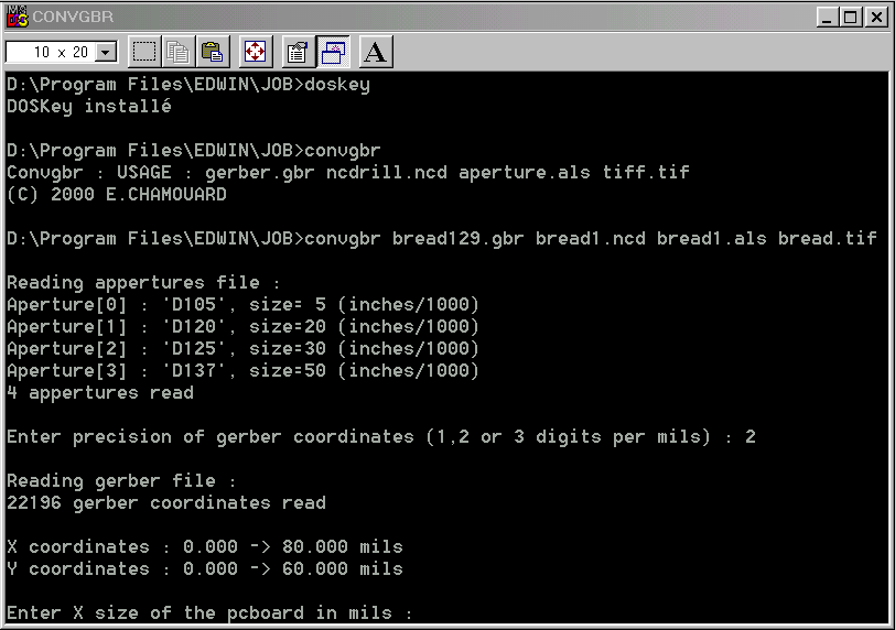 Un utilitaire DOS sous Windows convertissant les fichiers Gerber en fichiers Tiff permettant une impression du film de fabrication du circuit imprimé. |