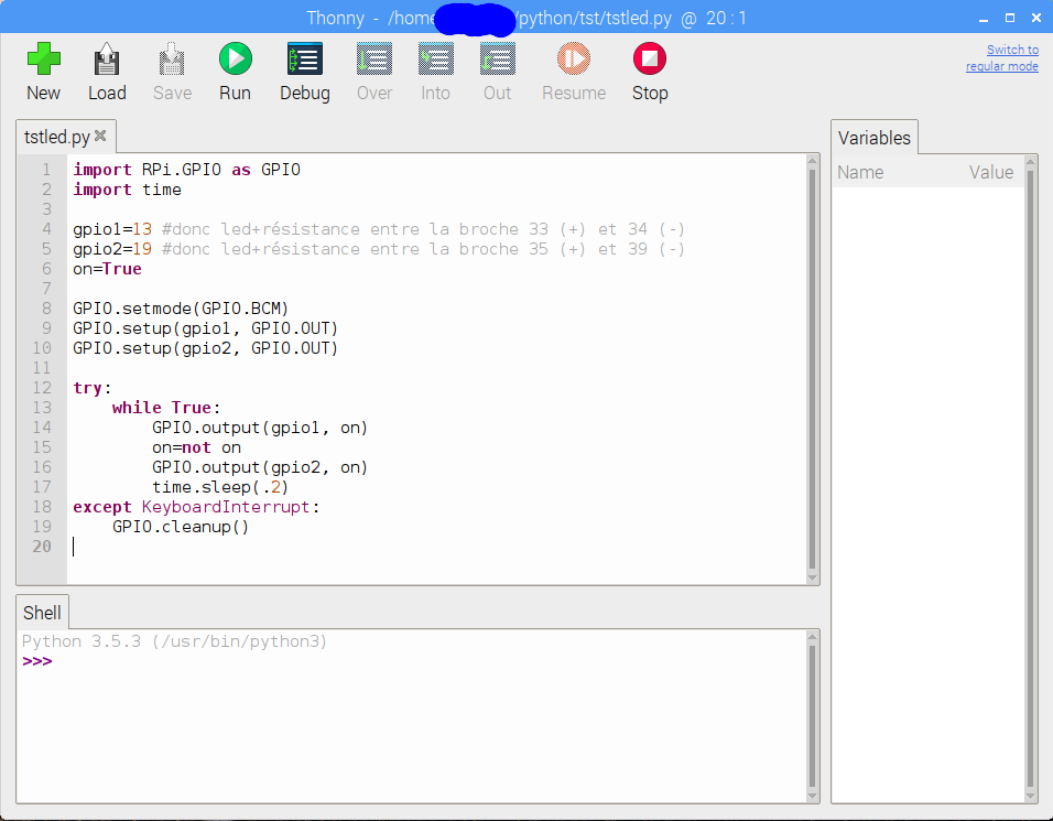 Test en Python3 : - Le driver Python3 est installé de base sous Buster, - le programme (source ici) qui fait clignoter alternativement les 2 leds. |