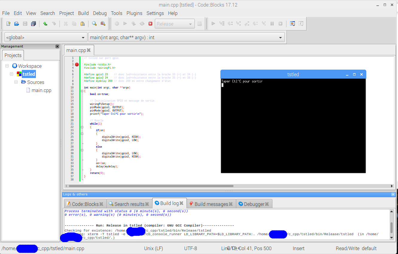 En C/C++, j'ai utilisé la bibliothèque WiringPi qui est aussi installée de base sous Buster. Il faut juste : - Inclure le fichier de déclaration de la bibliothèque (#include <wiringPi.h>;), - Faire l'édition de lien avec la bibliothèque (voir à gauche). WiringPi utilise sa propre numérotation des broches. La commande gpio readall permet d'avoir la correspondance sur la Raspberry que vous utilisez (voir à gauche). Vous trouverez ici le source du programme. La bibliothèque est très rapide. La dernière illustration montre le signal mesuré sur une des leds avec l'instruction delay(mydelay) retirée. On est à 8 MHz avec les deux leds sur une Raspberry 3B ! |
