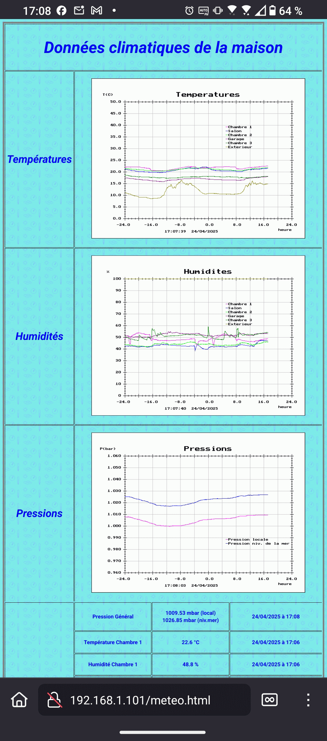 Ce projet rassemble un certain nombre de capteurs (chez moi 6 capteurs de température/humidité et un capteur de pression) qui envoient leur données via MQTT à la Raspberry. La Rasberry les compile et génère une page web à laquelle il est possible d'accéder (via le serveur Apache) par un PC, un smartphone et même un petit boitier ESP32. La page web contient les courbes de température, humidité et pression du jour courant et de la veille ainsi que les dernières mesures faites. En option, on peut recevoir les courbes par email. Je l'ai programmé pour les recevoir une fois par jour. - En haut, la page web générée (cliquer pour la voir complètement) - Au milieu, un snapshot de l'écran de mon smartphone affichant cette même page, - En bas, une photo de l'écran de mon boitier domotique basé sur un ESP32 (boitier AZ-Touch acheté chez AZ-Delivery). Ce projet est maintenant terminé, si vous voulez plus de détails que ceux ci-dessous, écrivez moi ! |