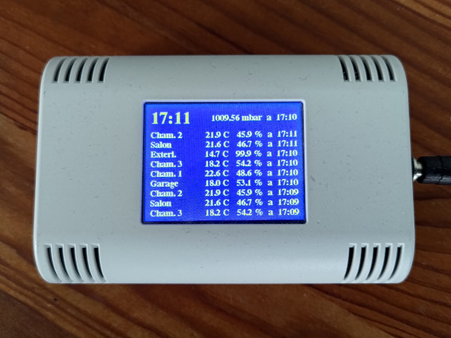 Les senseurs de température et d'humidité sont basés sur un capteur AM2322 et un micro-contôleur ESP-12E (de la famille ESP8286). Une page spécifique pour le circuit imprimé et le programme arrive bientôt. J'en ai fabriqué une dizaine que j'ai répartis dans la maison et un pour l'extérieur, ce dernier alimenté par 4 batteries NiMH). |